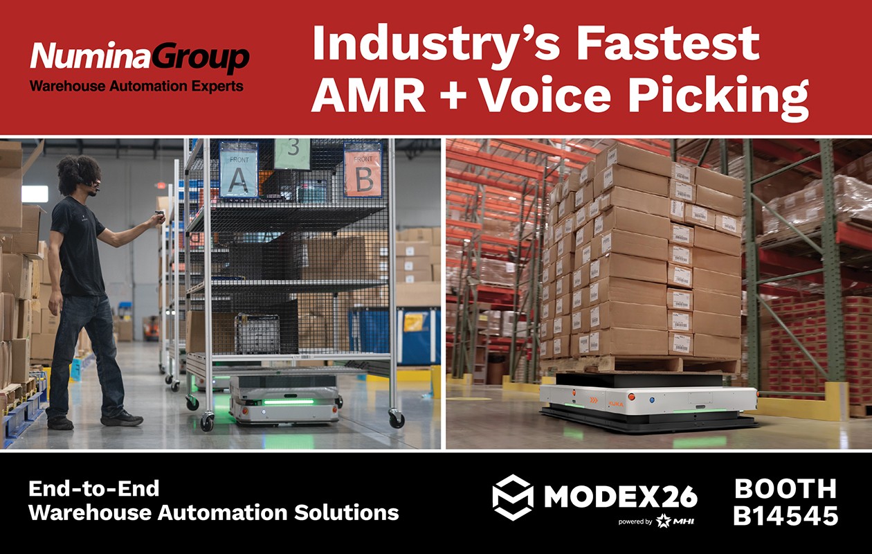 Woodridge, IL — April 2026 — Numina Group, a leading developer of real-time warehouse execution and control software (RDS™ WES-WCS), today announced an expanded partnership with KUKA to accelerate the performance and adoption of Batchbot™ 2.0, an autonomous mobile robot (AMR) and voice picking solution that is redefining the cost and performance benchmarks of modern order fulfillment. The solution will be featured at MODEX 2026 in Booth B14545, with KUKA Robotics Corporation exhibiting in Booth B15132. Visit both booths to see how real-time orchestration and high-capacity AMRs increase throughput and reduce labor.